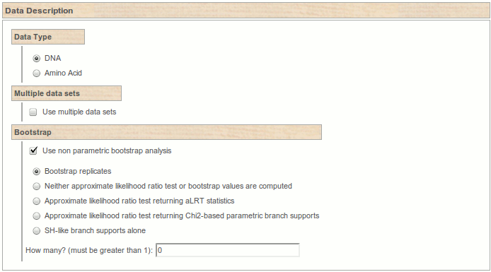 - check the “Use non parametric bootstrap analysis” option and have a look to the amount of alternatives PhyML proposes. Which of those option would you check? Have a look to PhyML user guide and follow references cited, in order to help your choice.