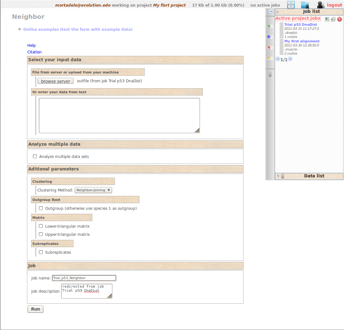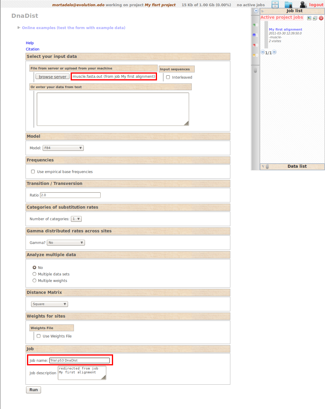 For this trial lets just name our job “Trial p53 DnaDist” and click on “run”.