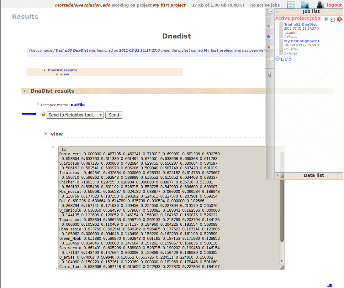 At this step we should have a distance Matrix corresponding to the alignment of some p53 sequences. If we go to the corresponding output page we can directly send this distance matrix as input file to the Neigbhor software.