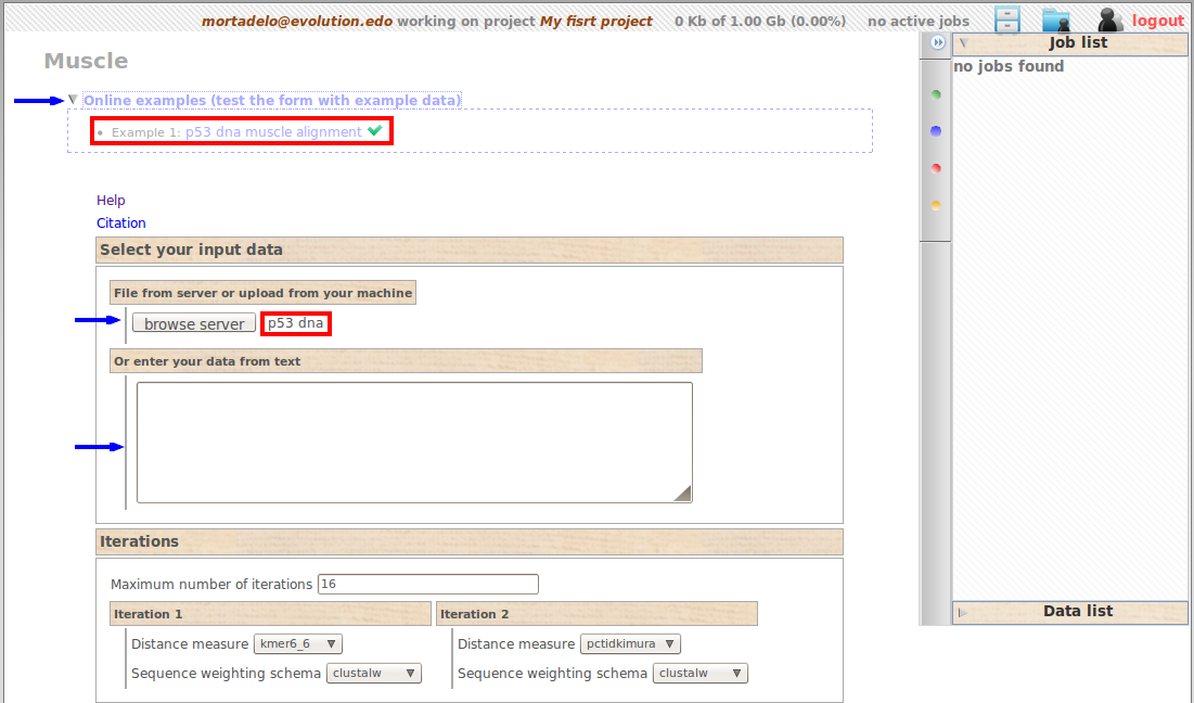 Each one of the tool/Utility in Phylemon can be launched with at least one example, in this trial we will use the example in muscle, an alignment in FASTA format of p53's nucleotidic sequence of some vertebrates. To load the example file, just expand the example menu, and fill in form with desired example.