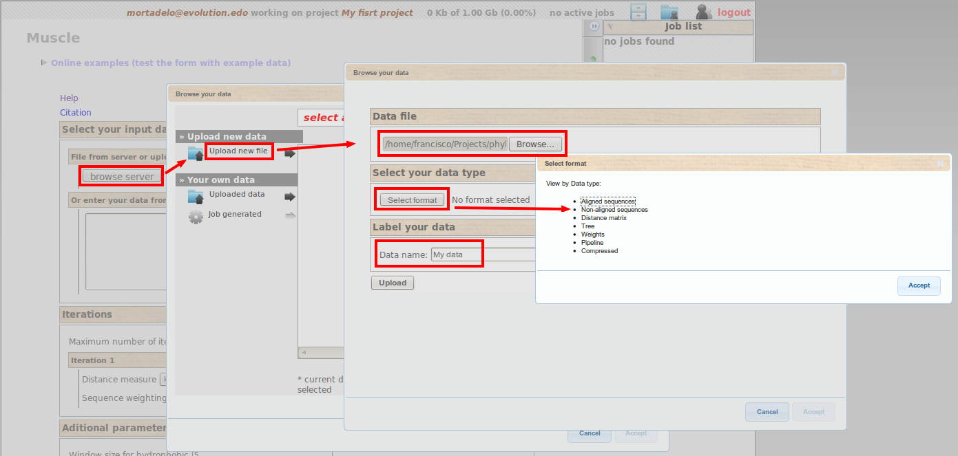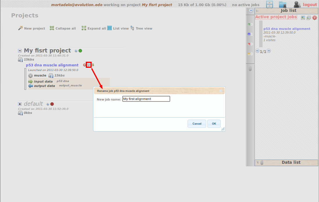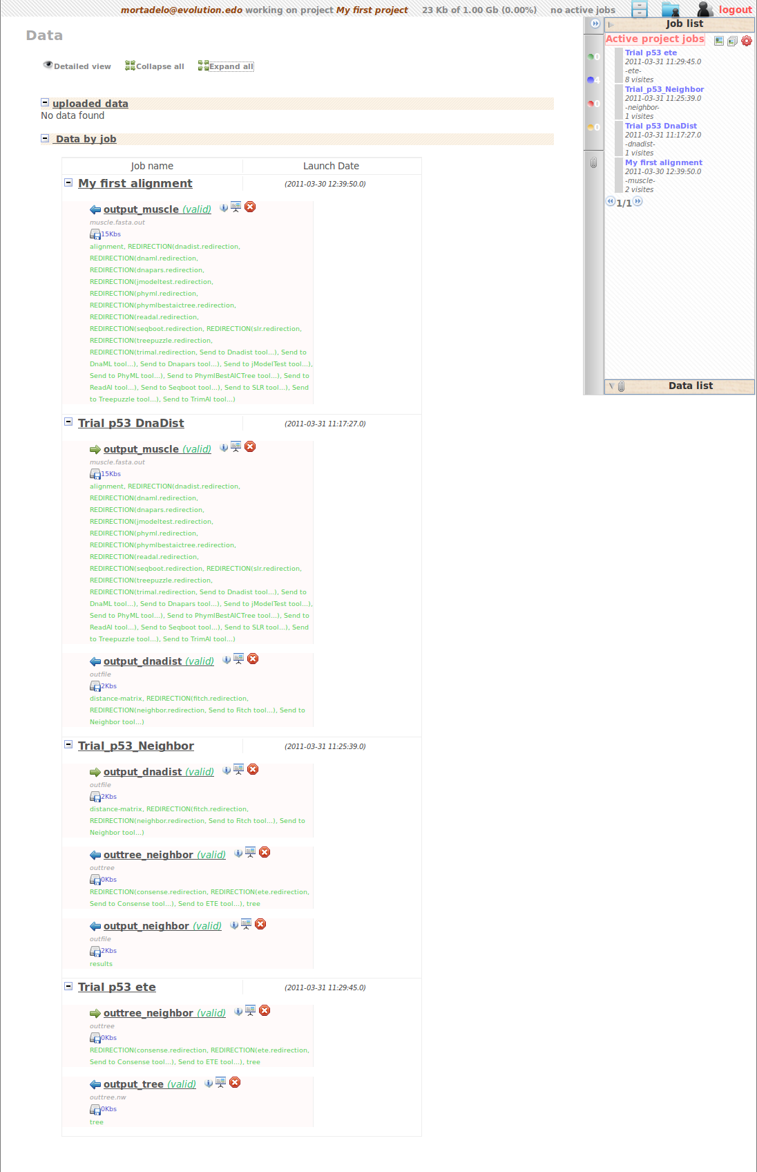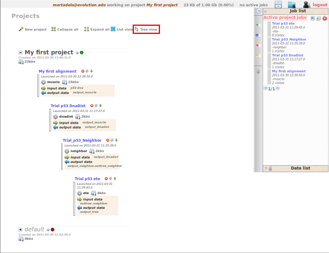 ). Here you have in chronological inverse order, all the jobs you run under your different projects. All the files you used and generated are here stored, and, as you will be able to use them in different analysis, it is use full to name them in a meaningful way.